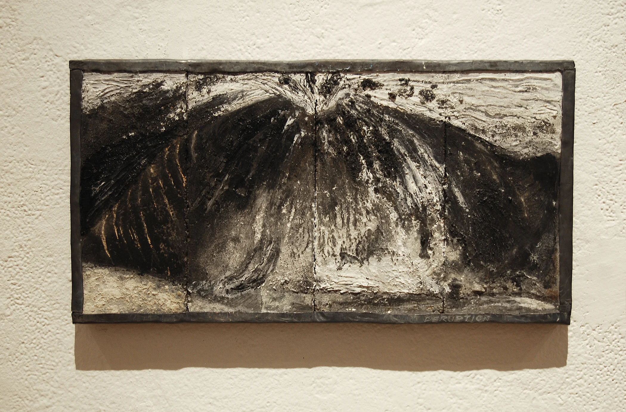 "Deruption" was created in 2012 and is a study for a future larger work. It is a mixed media piece that consists of lead, marble dust, pulverized Mount Etna igneous rock, graphite, oil paint and bricks. Its dimensions are 17" w x 8.5" h x 1" d. "Deruption" was created shortly after the artist's trip to Sicily made partly to trace his Sicilian ancestry and to resolve confusion about the origins of the Ardito family. The artist's accommodations overlooked Mount Etna, one of the most active volcanoes in the world.
