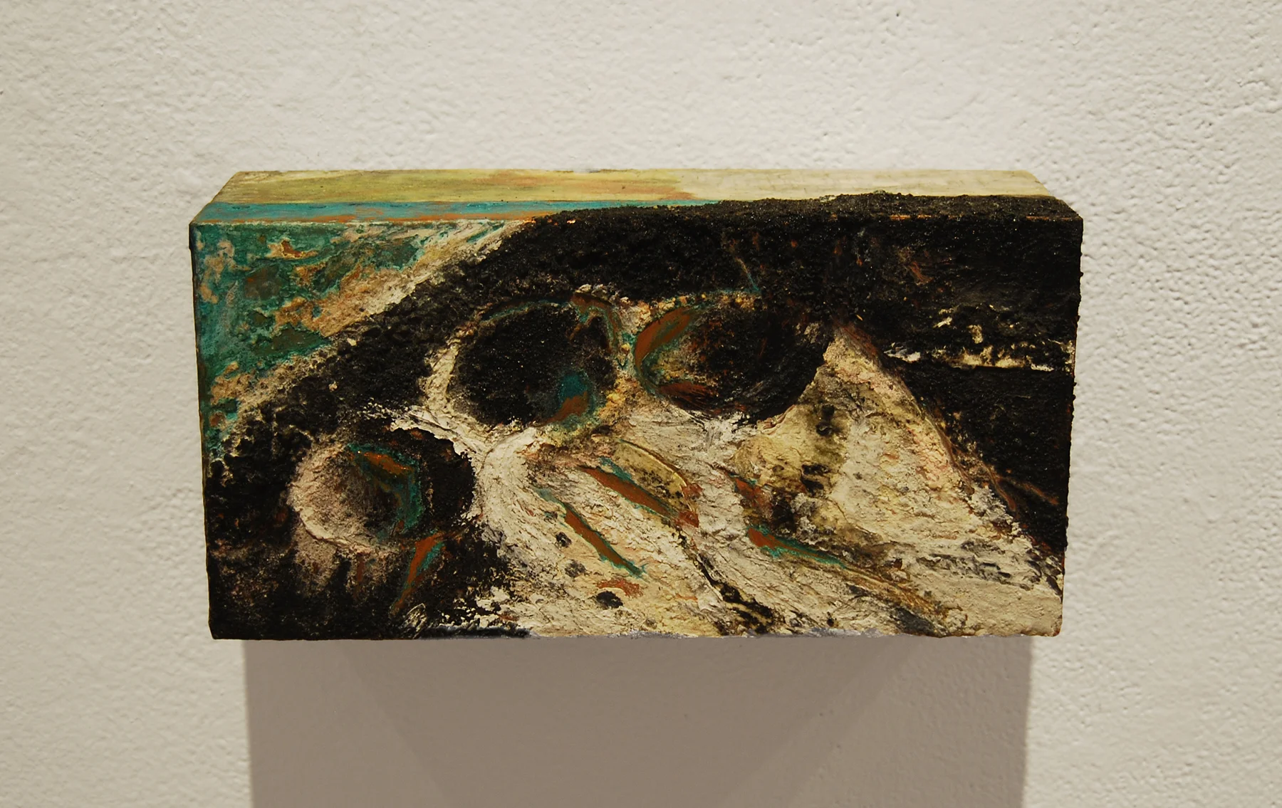 "Catania" is a three dimensional mixed-media work that was created in 2012. It consists of PT wood, copper, paper, wax, marble dust, pulverized Mount Etna igneous rock, cold wax, oil paint and oil mediums. It's dimensions are 11" w x 5.5" h x 4" d. "Catania" was created shortly after the artist's trip to Sicily made partly to trace his Sicilian ancestry and to resolve confusion about the origins of the Ardito family. The artist's accommodations overlooked Mount Etna, one of the most active volcanoes in the world.