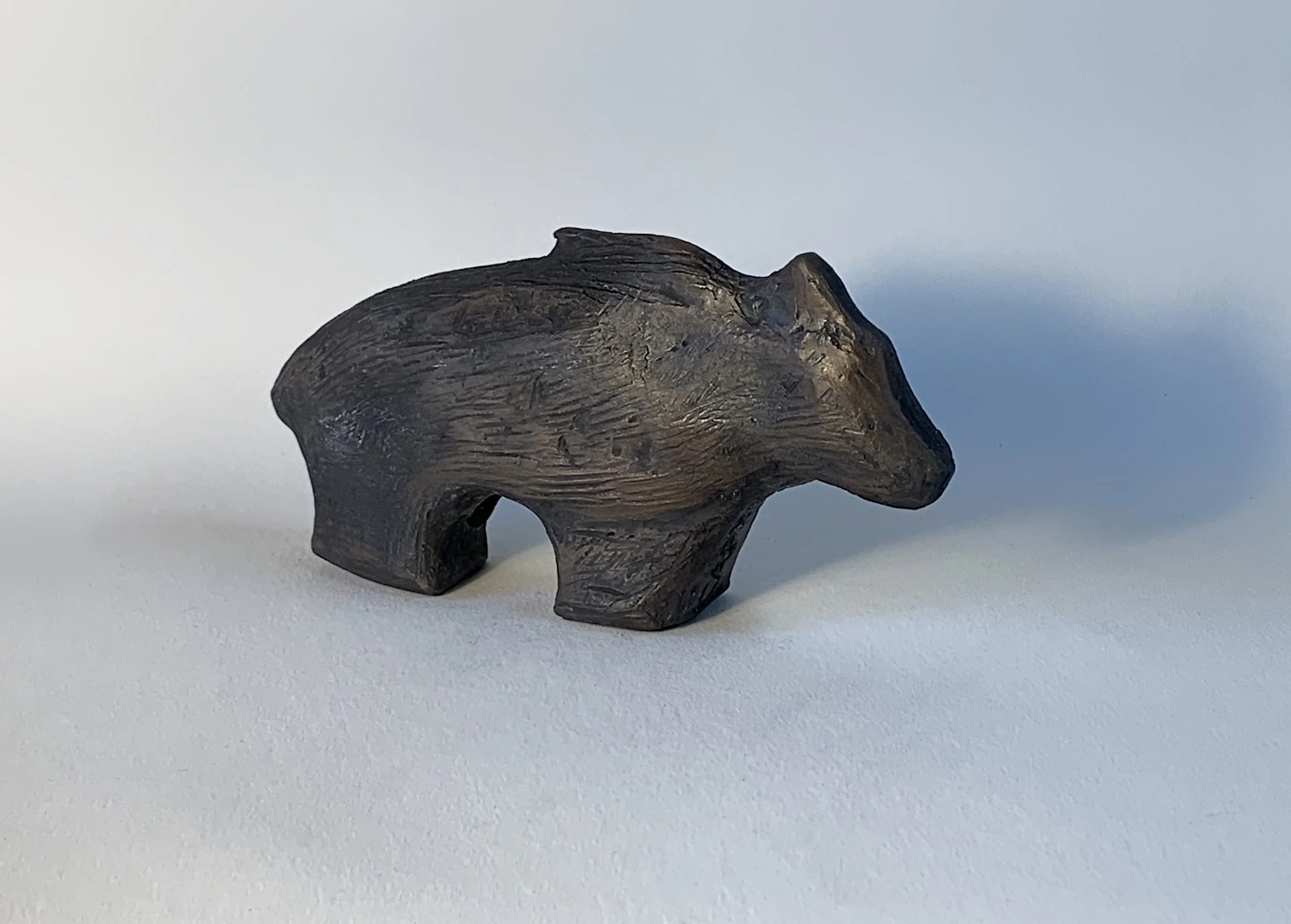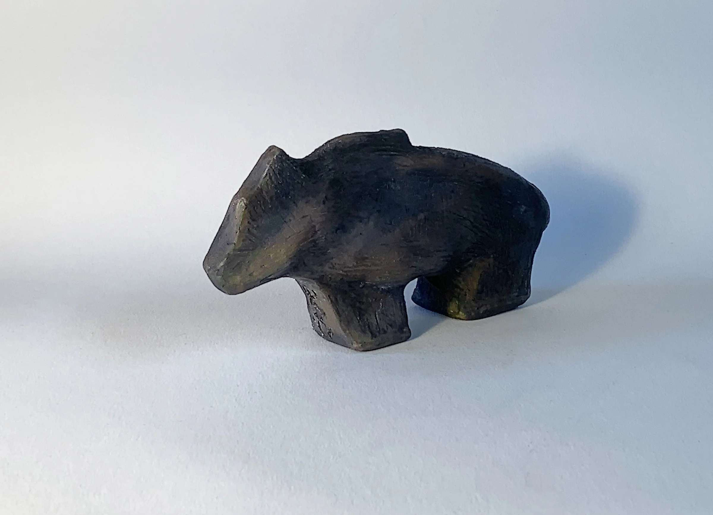 The sculptures on this page are made of high fire black clay and are coated with black under glaze and butcher’s wax. They are each inspired by a combination (hybrid) of four-legged animals including dogs, horses, bulls and coyotes. The sculptural approach is informed by ancient Greek and Egyptian forms including the simplification, abstraction and idealization of natural forms. These were created in 2021 on Cape Cod during the height of the Covid-19 pandemic.